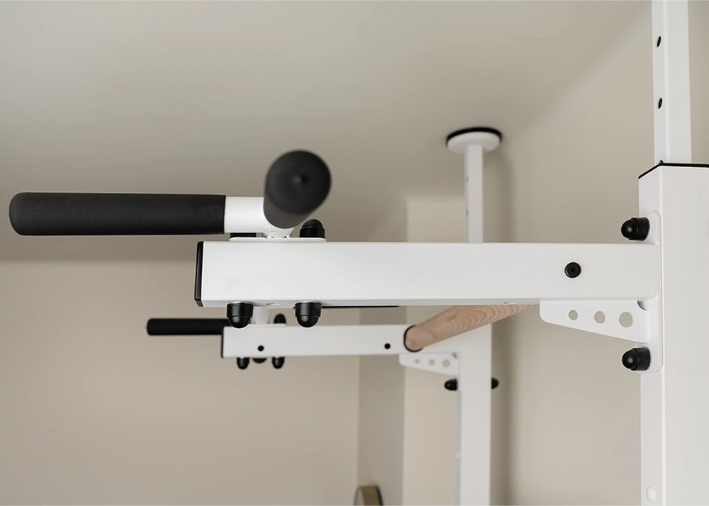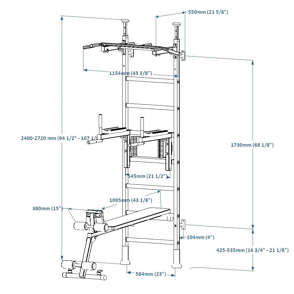 Multifunkčná rebrina BenchK 523W + A204 je model vytvorený pre celú rodinu. Maximálna hmotnosť cvičenca je 150 kg. Vertikálne bočné profily s práškovým nástrekom sú jednotným prvkom, nemajú žiadne spoje vo forme zvarov alebo skrutiek, čo výrazne zvyšuje životnosť výrobku. Rebrina obsahuje 8 oválnych bukových rukoväťových priečok.Dizajn rebriny bol navrhnutý tak, aby zodpovedal súčasným trendom v dizajne interiéru. Výhodou rebriny BenchK 523W + A204 je možnosť dvojakej montáže. Bradlá BenchK Dip Bar DB0W majú 4 háčiky s hrúbkou 4 mm, háčky sú vybavené plstenou podložkou, aby sa zabránilo poškriabaniu drevených priečok rebriny. Odnímateľná štruktúra bradiel Vám umožňuje ľahko meniť ich výšku. Po otočení bradiel a opätovnom zavesení na rebriny, Vám vznikne držiak na veľkú činku. Max.hmotnošť veľkej činky je 200 kg. Bradlá BenchK Dip Bar DB0W zahŕňajú odolné a ľahko ošetriteľné lakťové opierky vyrobené z integrovanej polyuretánovej peny a štyri protišmykové madlá. Lavica Bench B0W neobsahuje žiadny prvok vyrobený z ekologickej kože alebo špongie. Lavica je obojstranná s dvoma valčekmi pod kolenami. Celá opierka chrbta a kolenné valce sú jednotný prvok vyrobený z integrovaného polyuretánu. Dosiahlo sa to vďaka použitiu moderných strojov a technológií. Kovová kostra je vyrobená z profilu 50 x 40 mm s hrúbkou 2 mm. Prášková farba. Lavička vám umožňuje vykonávať rôzne brušné cvičenia, cvičenia pod uhlom s činkou alebo činkami. Gymnastické doplnky budú stimulom na prijímanie nových výziev a fyzickej aktivity. Sada príslušenstva obsahuje : pár gymnastických kruhov, horolezecké lano s drevenou hojdačkou. Doplnky môžu používať osoby s hmotnosťou do 80 kg. Gymnastické kruhy sú vyrobené z preglejky z bukového dreva a sú zavesené na čiernych pruhoch. Pásy sú vybavené prackou, ktorá umožňuje rýchle nastavenie ich dĺžky, ako aj ľahkú demontáž. Vedľa pracky je suchý zips, v ktorom môžete previnúť nadbytočný pás. Lano vyrobené zo 100% prírodnej bavlny je ručne zviazané v hornej časti rebríka a pripevnené na spodnej časti, čím sa eliminuje použitie kovu alebo plastu. Lano sa dá použiť na lezenie alebo pre hojdačku. Výrobok spĺňa bezpečnostné požiadavky obsiahnuté v PN-EN 12346: 2001, PN-EN 913: 2019-03.