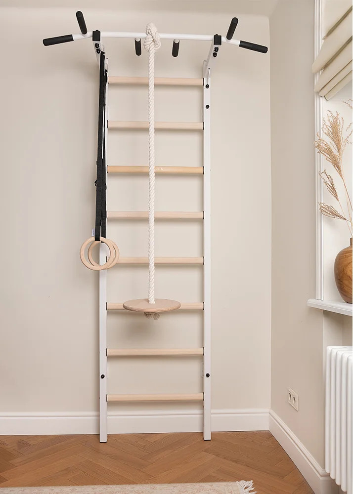 Gymnastické doplnky budú stimulom na prijímanie nových výziev a fyzickej aktivity. Sada príslušenstva obsahuje : pár gymnastických kruhov, horolezecké lano s drevenou hojdačkou. Doplnky môžu používať osoby s hmotnosťou do 80 kg. Gymnastické kruhy sú vyrobené z preglejky z bukového dreva a sú zavesené na čiernych pruhoch. Pásy sú vybavené prackou, ktorá umožňuje rýchle nastavenie ich dĺžky, ako aj ľahkú demontáž. Vedľa pracky je suchý zips, v ktorom môžete previnúť nadbytočný pás. Lano vyrobené zo 100% prírodnej bavlny je ručne zviazané v hornej časti rebríka a pripevnené na spodnej časti, čím sa eliminuje použitie kovu alebo plastu. Lano sa dá použiť na lezenie alebo pre hojdačku.Gymnastické doplnky sú v súlade s normami PN-EN 12346: 2001, PN-EN 913: 2019-03.