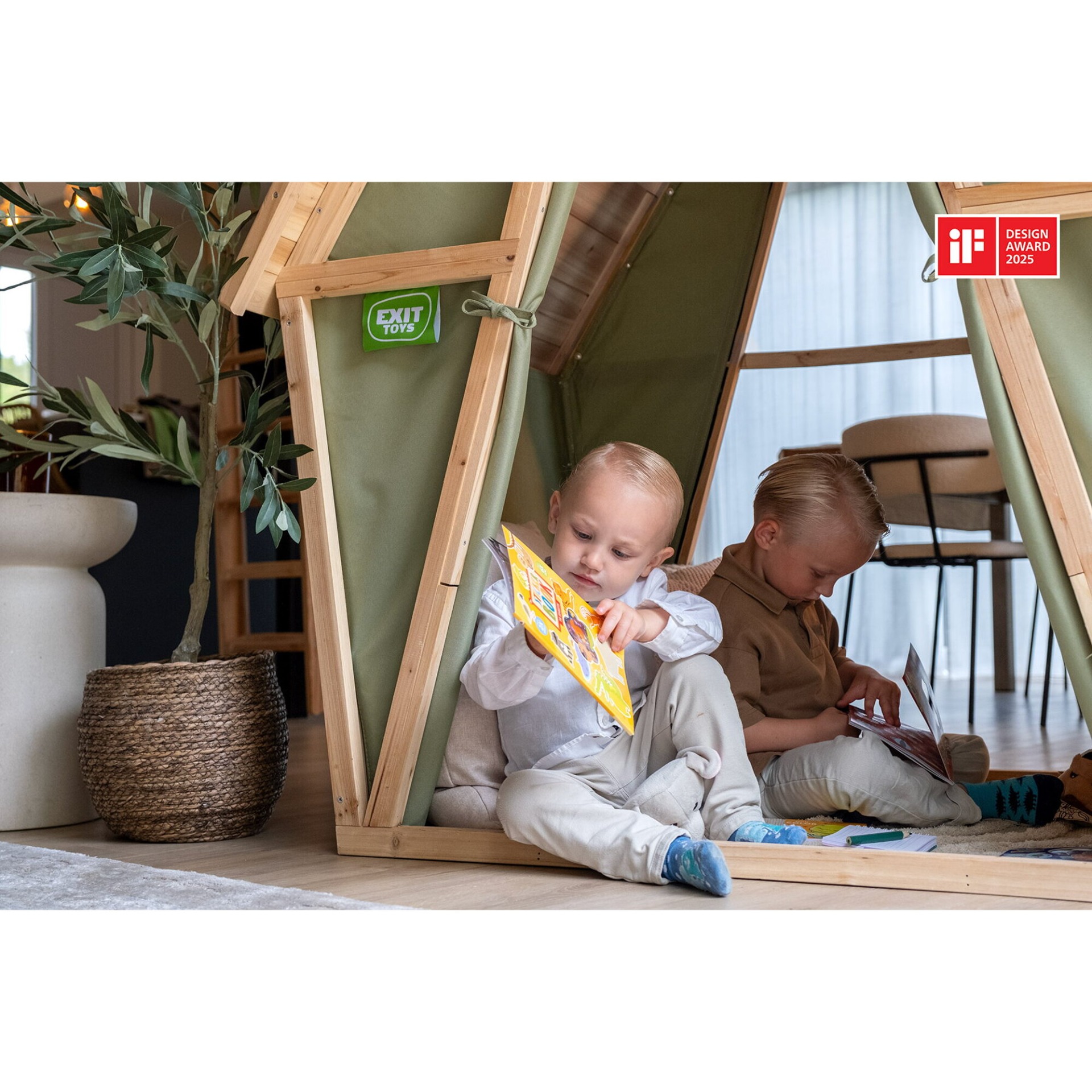 EXIT Yuki 100 je čarovný detský domček, ktorý v sebe spája pohodlie a dobrodružstvo. Pevný drevený rám poskytuje stabilitu klasického domčeka, zatiaľ čo odolná zelená plachta vytvára útulnú atmosféru stanu. Či už si vaše dieťa chce čítať knižku v "kempe" alebo zažiť safari dobrodružstvo vo svojej "chate", s domčekom Yuki má nekonečné možnosti. Vďaka špicatej streche a hravému prírodnému dizajnu sa stane krásnym doplnkom každej záhrady – skutočný "must-have" pre každú rodinu!